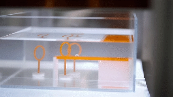 At the SRC, a PlayStation 5 controller connected to a Helmholtz coil system is used to steer the millirobot through an underwater course. Visitors can watch as the robot navigates through plastic hoops, showcasing its precise control and adaptability in real time.