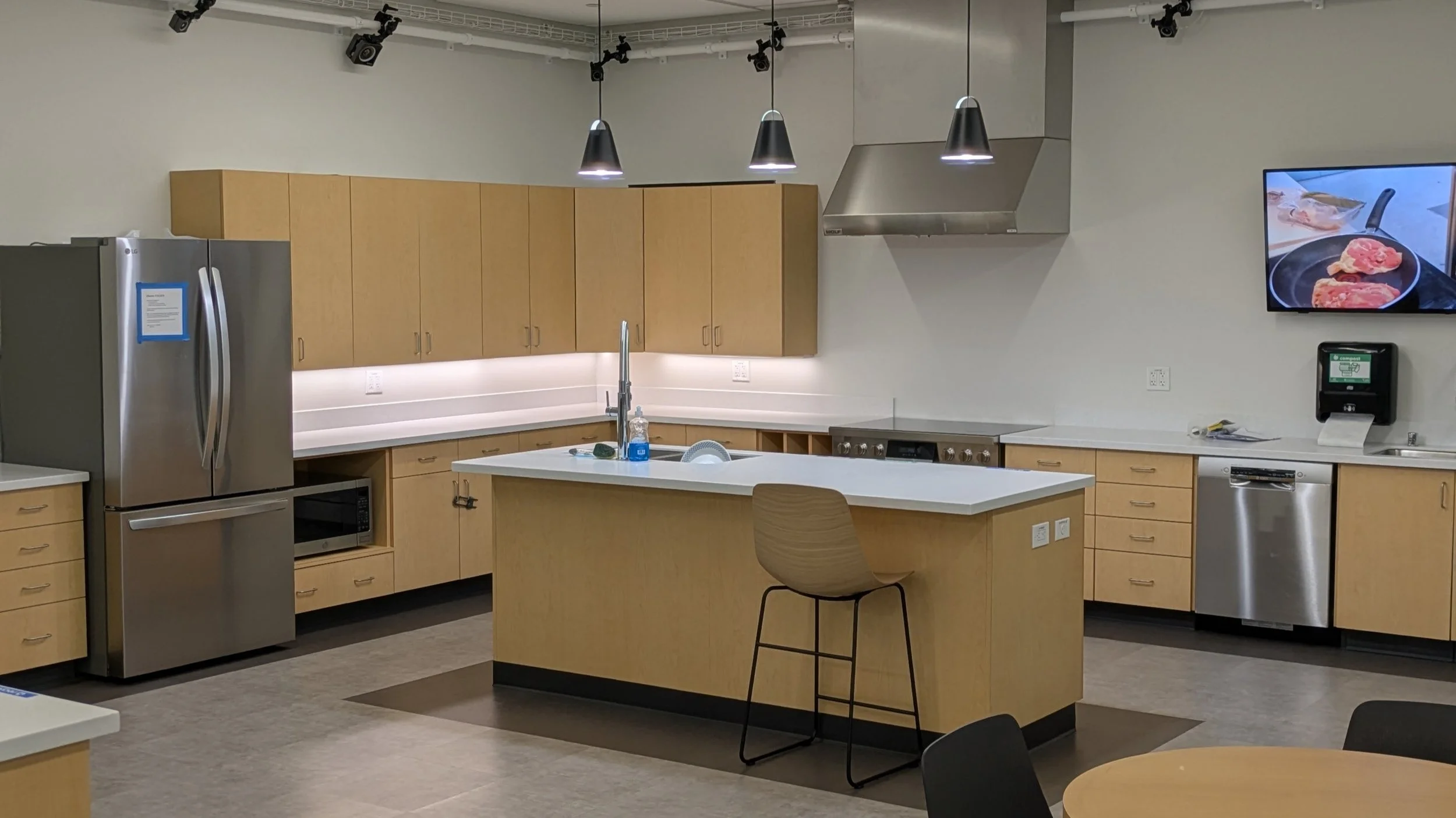 The Domestic Robotics suite at the Stanford Robotics Center includes a fully functioning kitchen designed to support research in household assistance. This space provides a realistic environment for testing robotic systems in common kitchen tasks such as cooking assistance, organizing kitchen items, and performing cleaning duties.